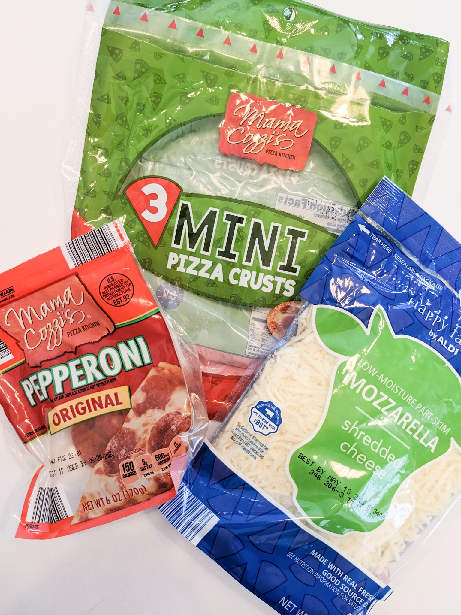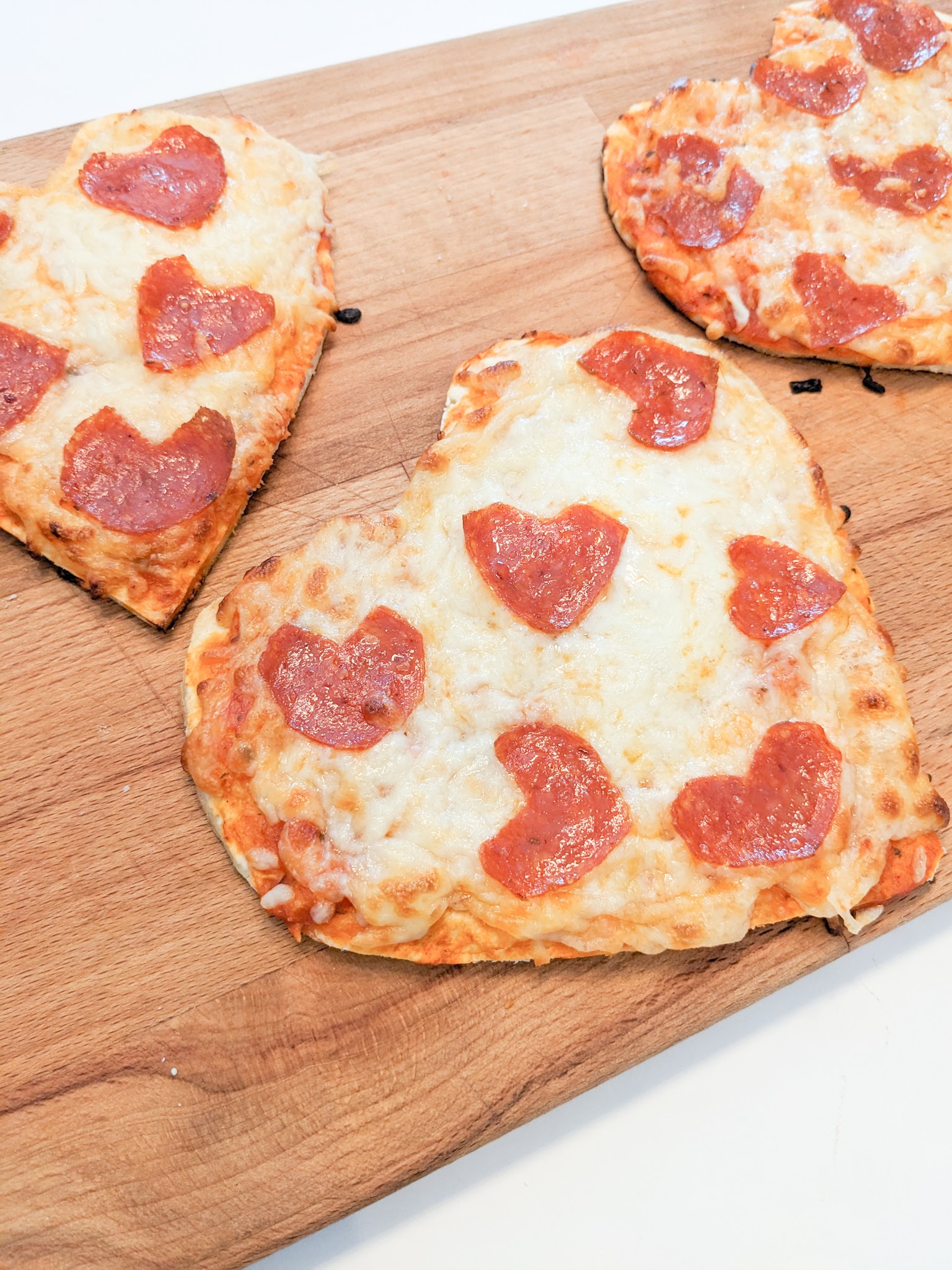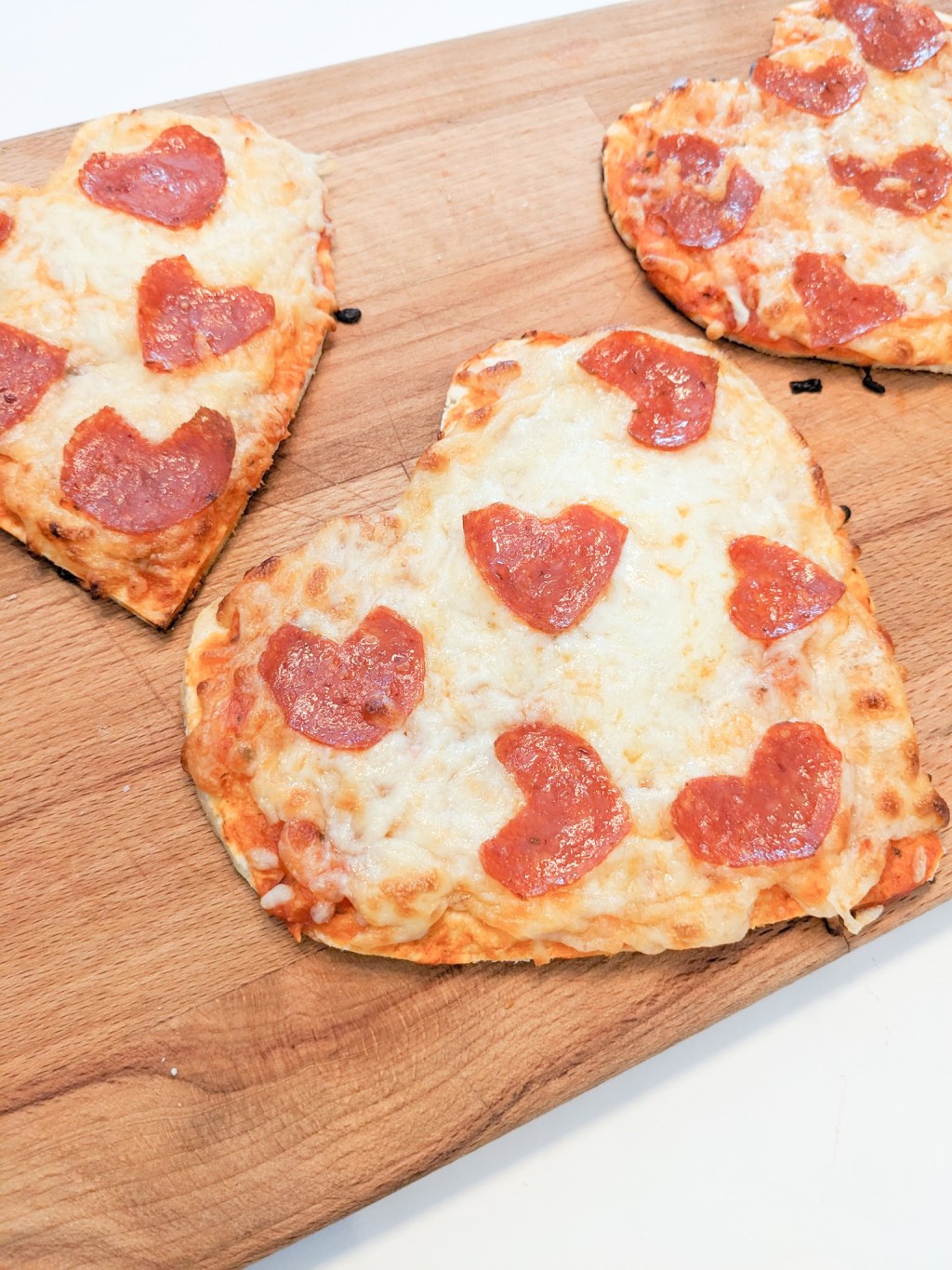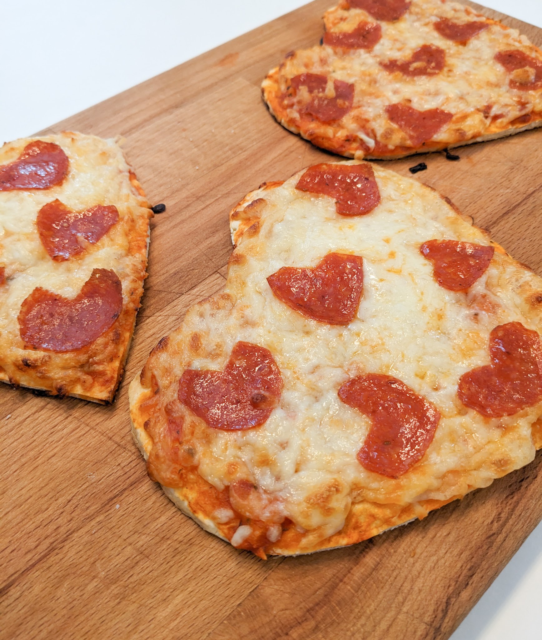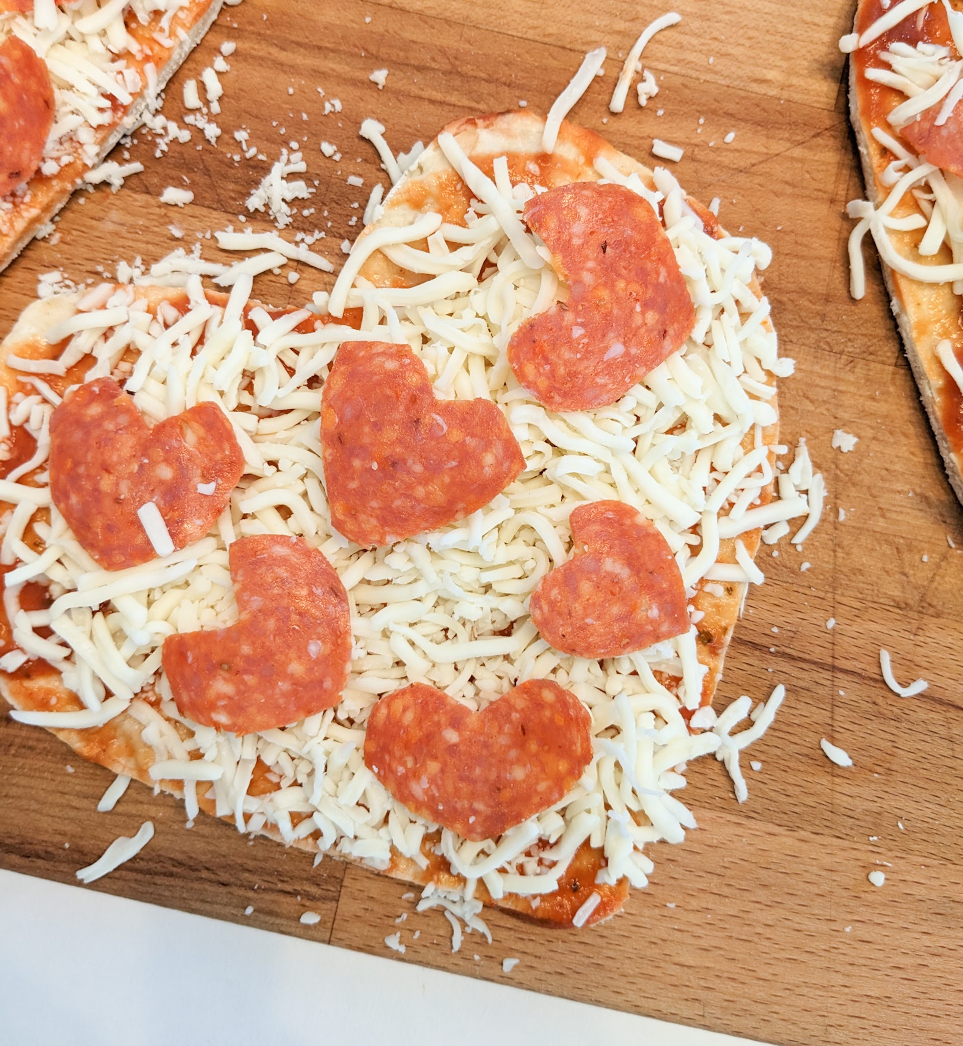 We were able to get all our ingredients at our local Aldi store. We used the Mama Cozzi brand thin crust pizza crusts and pepperoni slices, and the happy farm mozzarella cheese. You can usually find the pizza crusts in the aisle with all the boxed pasta, jarred sauces, canned goods, and baking supplies. To get started, preheat your oven to 450°F. Take your thin crusts pizzas out of the package, and using some kitchen scissors, cut the crusts into heart shapes. Place the crusts on a baking sheet and brush the crusts with some olive oil. Spread some pizza sauce on top of the olive oiled crusts. Next, sprinkle on some mozzarella cheese. You can add as much cheese as you like. Next, take some pepperoni slices and cut the pepperoni into heart shapes as well. Then place the pepperoni slices on top of the mozzarella cheese on the pizzas. Place in the oven for 7-9 minutes until the cheese is a golden brown color. Remove the baking sheet from the oven and allow the pizzas to cool a little before slicing and serving.