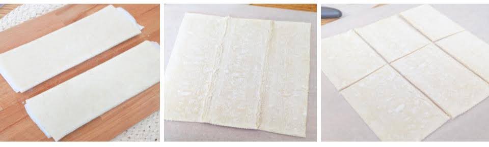 - Unfold the pastry sheet and cut the sheet into 6 pieces, about 3″ by 5″. To do this, I used a pizza cutter and cut the sheet down the seam lines and then turned the sheet 90° and cut the sheet down the middle.