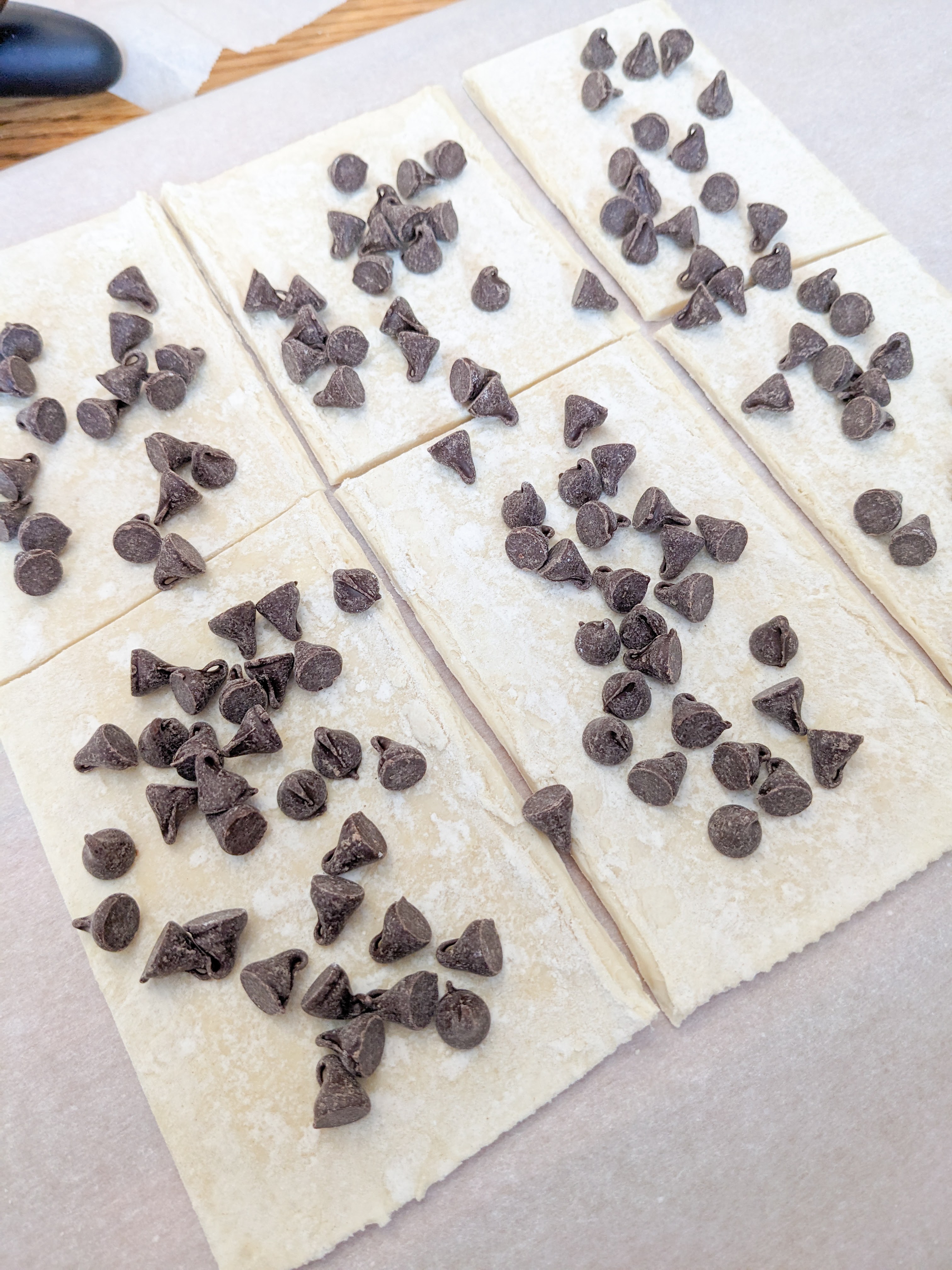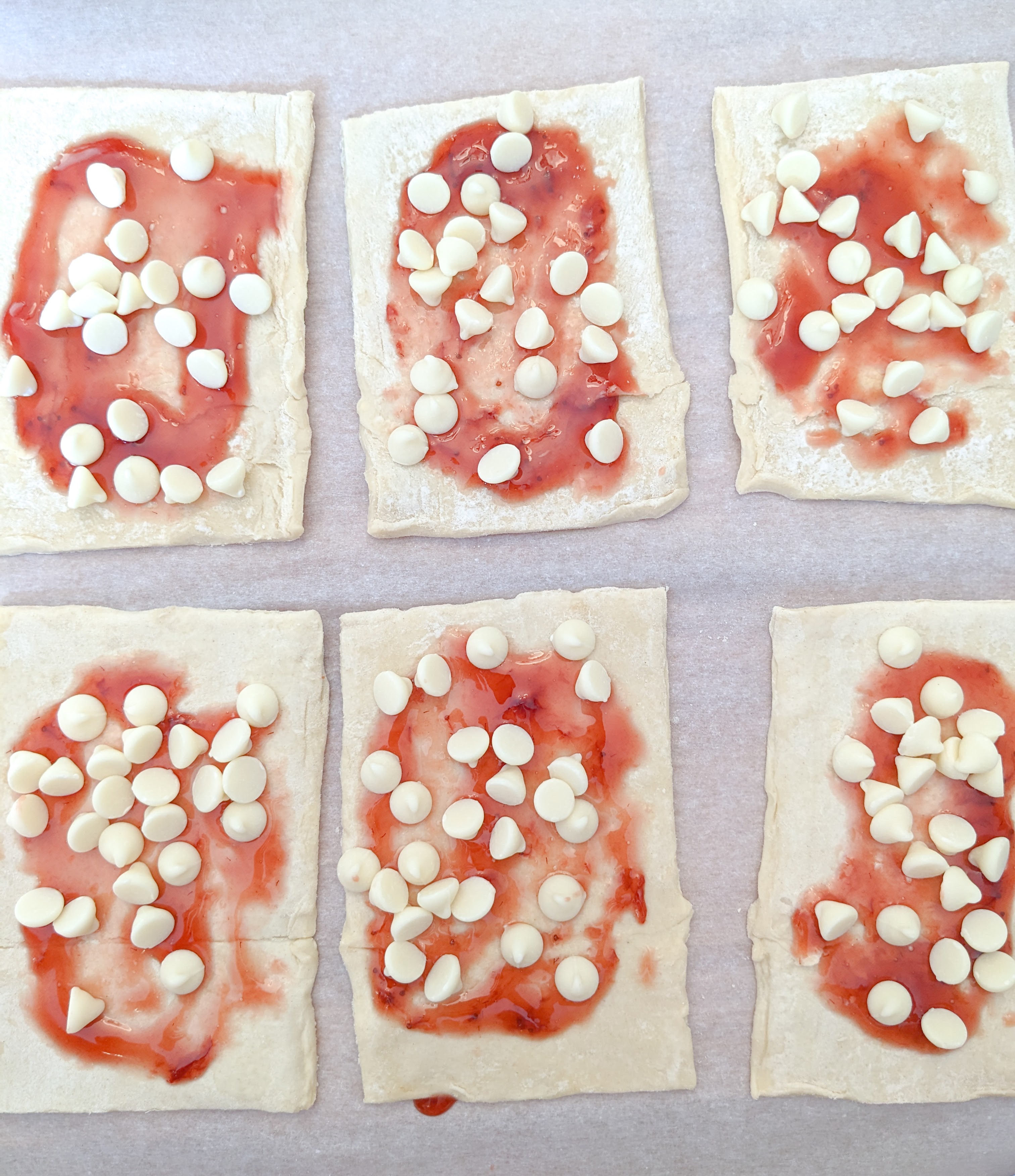 - A tasty variation is a strawberry white chocolate puff pastry bite. To make this, substitute the chocolate chips for strawberry jam and white chocolate chips. After cutting your puff pastry rectangles, spread about a tablespoon of strawberry jam on each rectangle and sprinkle with white chocolate chips.