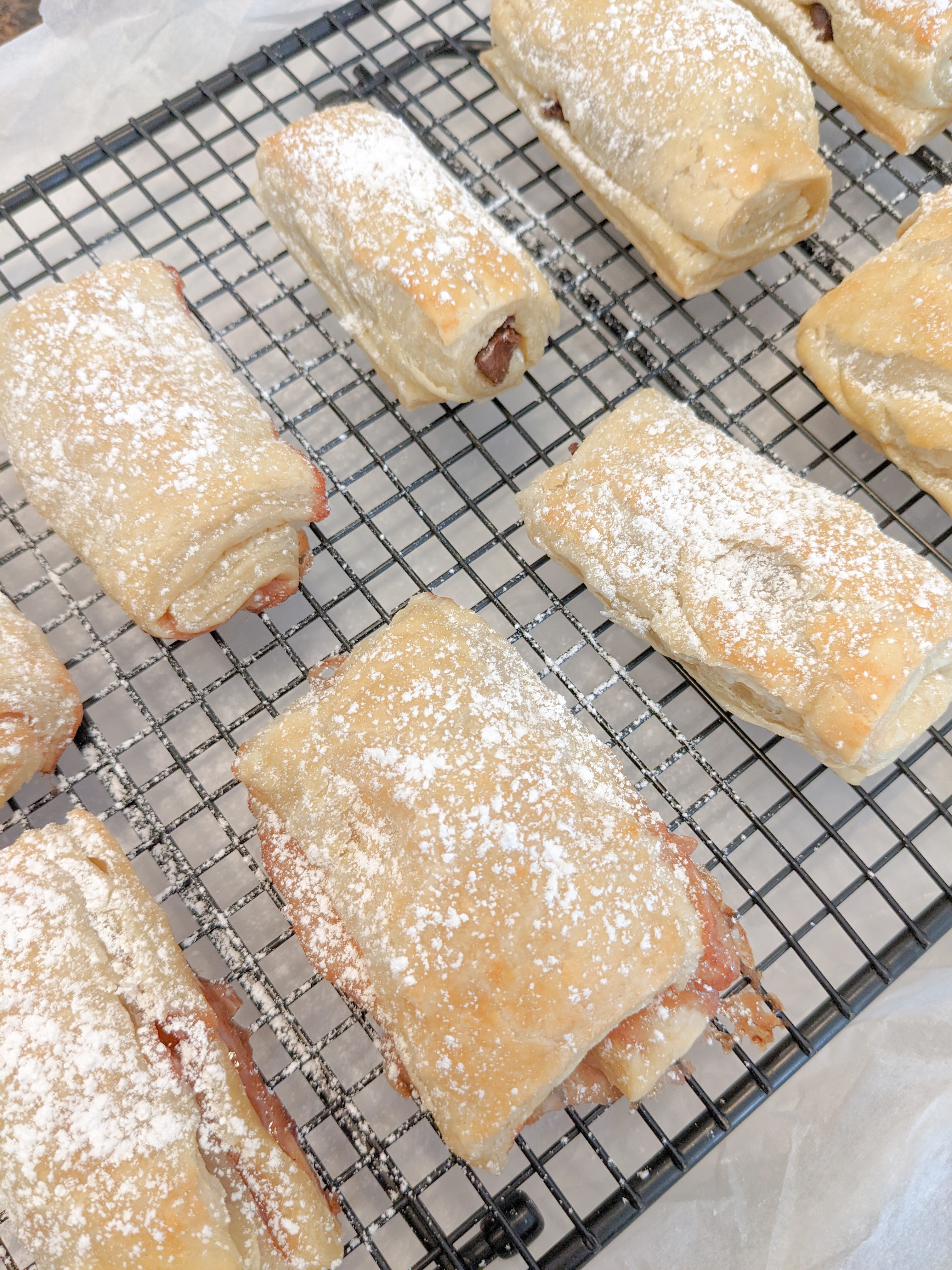 Sprinkle the chocolate chips over the pastry sheet. Roll each rectangle up, with the chocolate chips inside. Arrange the puff pastry evenly on the baking sheet with the seam side down. Make an egg wash by cracking an egg into a bowl and add a splash of water. Whisk the egg and then brush the egg wash on top of the puff pastry bites. Bake for about 20 minutes until they are golden brown. Remove from the oven and move to acooling rack. Allow the pastry bites to cool completely, and then dust with powdered sugar.